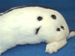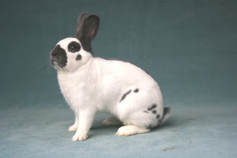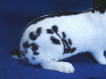 Die Größe der Seitenflecken halte ich mit der angegebenen Größe von ca. 2 cm für richtig gewählt. Sie ist passend zum Größenrahmen der Kleinschecken. In der Konsequenz erscheint mir dann auch die angegebene Größe von ca. 3 cm bei den Riesenschecken als richtig, während bei den Zwergschecken die Standardforderung völlige „daneben liegt.“ Hier wird von nicht zu großen Flecken von 2 bis 3 cm Durchmesser gesprochen. Man stelle sich nur ein Zwergkaninchen mit 7 Seitenflecken von knapp 3 cm Durchmesser vor. Das Ergebnis wäre eine Mantelzeichnung, die noch über den Schenkel hinausgehen würde! Hier bedarf es einer Korrektur, die züchterisch aufgrund der rasanten Entwicklung dieser Rasse in den letzten zwei/drei Jahren jedoch auch schon längst vollzogen ist. In der züchterischen Praxis sind auch die geforderten 5 bis 7 Punkte einigermaßen häufig umsetzbar. Die Schwierigkeit bei der idealen Seitenzeichnung liegt zweifelsohne darin, dass die Punkte auf der Flanke und dem Schenkel gleichmäßig verteilt sein sollen. (Man strecke ein Hand aus und an jeder Fingerkuppe sollte eine Seitenfleck sein. Diese stellen den äußeren Rahmen dar. Die restlichen Flecken liegen dann im Bereich der Handfläche -auf der Mitte des Schenkels-)